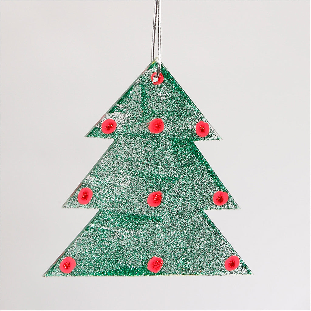 Single ornament of clear acryligc with a hole in the top Display box with 4 different designs: star, heart, snow crystal and christmas tree.