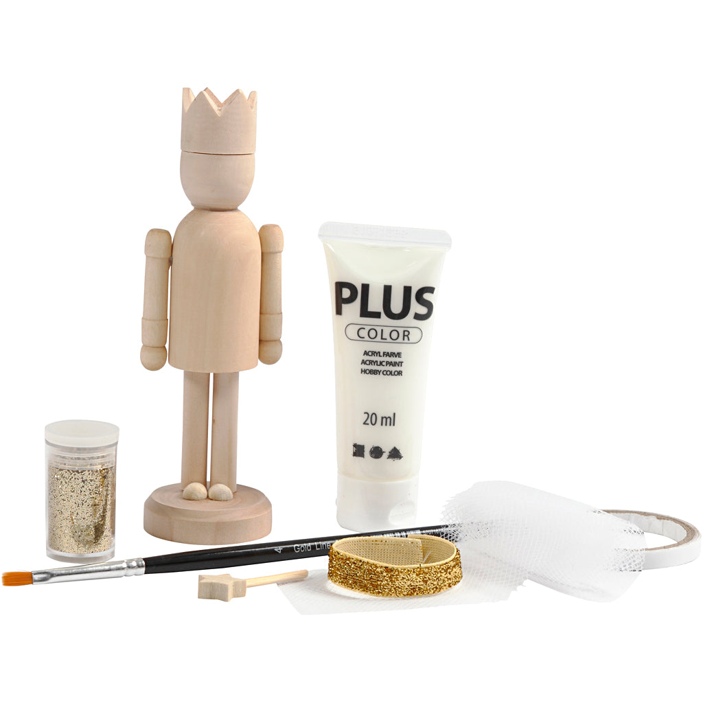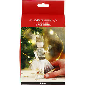 Material set for 1 ballarina consisting of figure and festive wood, tulle, glitter ribbon, paint, brush, double sided tape and glitter Contents: 1 figure and wood stick, 20ml off white craft paint, brush, 5g gold glitter, 1x10cm gold-colored glitter.