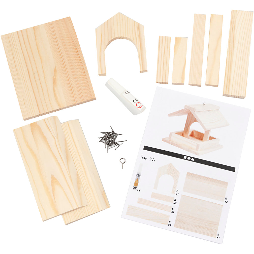 Material set for collectible bird feeding table of light wood. Guidance included.