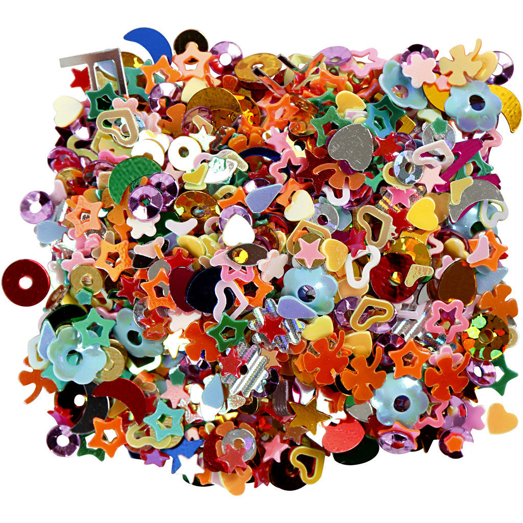 Mix of very small sequins in various shapes and bright colours. Supplied in a handy container with shaker top.