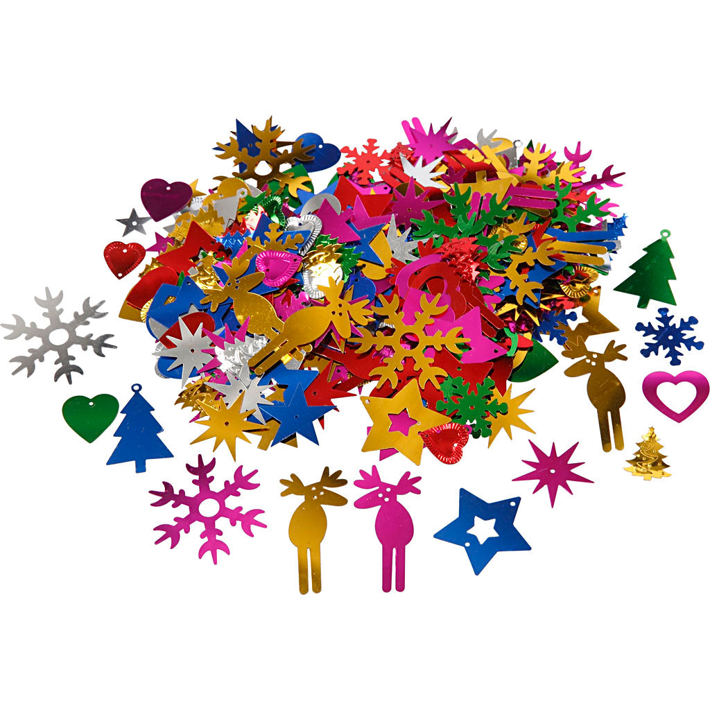 Assortment of sequins in various shapes and colours.