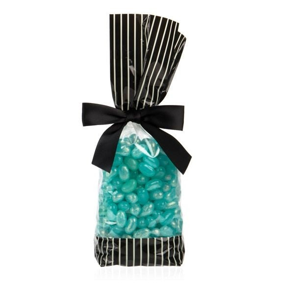 Side gusset bags With printed designs are a fun way to package gifts and treats. Our G2BKC printed gusset bag measures 67 x 48 x 273 mm and is a great choice for candy, chocolates, popcorn, crafts, favors, and more. The top and bottom of the bag is bordered With a black With cream stripes design for an upscale look. Dress this bag up With ribbons, bows, or twist ties to complete the look. The laminated material is 40 micron thick and crystal clear. Expandable sides provide the extra wiggle room for bulky or odd-shaped products. This bag is bottom-sealed for extra strength. This bag is food safe and heat sealable. Use a standard hand sealer for a heat sealable closure.