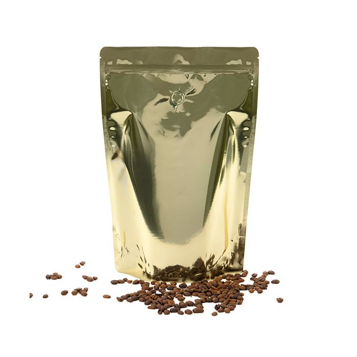 ZBGM6SGB is our classic Stand Up Zipper Pouch that has been redesigned to hold coffee and tea. This 125 micron pouch has outer measurements of 22,9 x 12,1 x 34,3 cm and usable space of 21,9 x 10,2 x 30,3 cm It is ideal for holding 2 pounds of whole coffee beans, coffee grounds, and tea leaves. It features a one-way degassing valve that vents the CO2. Stand Up Pouches are great for standing on a retail shelf or counter. This bag is made from high barrier materials and features a resealable zipper to lock in freshness. The solid shimmer gold exterior of this bag allows plenty of room for branding using labels or stickers. Tear notches are located above the zipper for ease of opening if heat sealed closed.