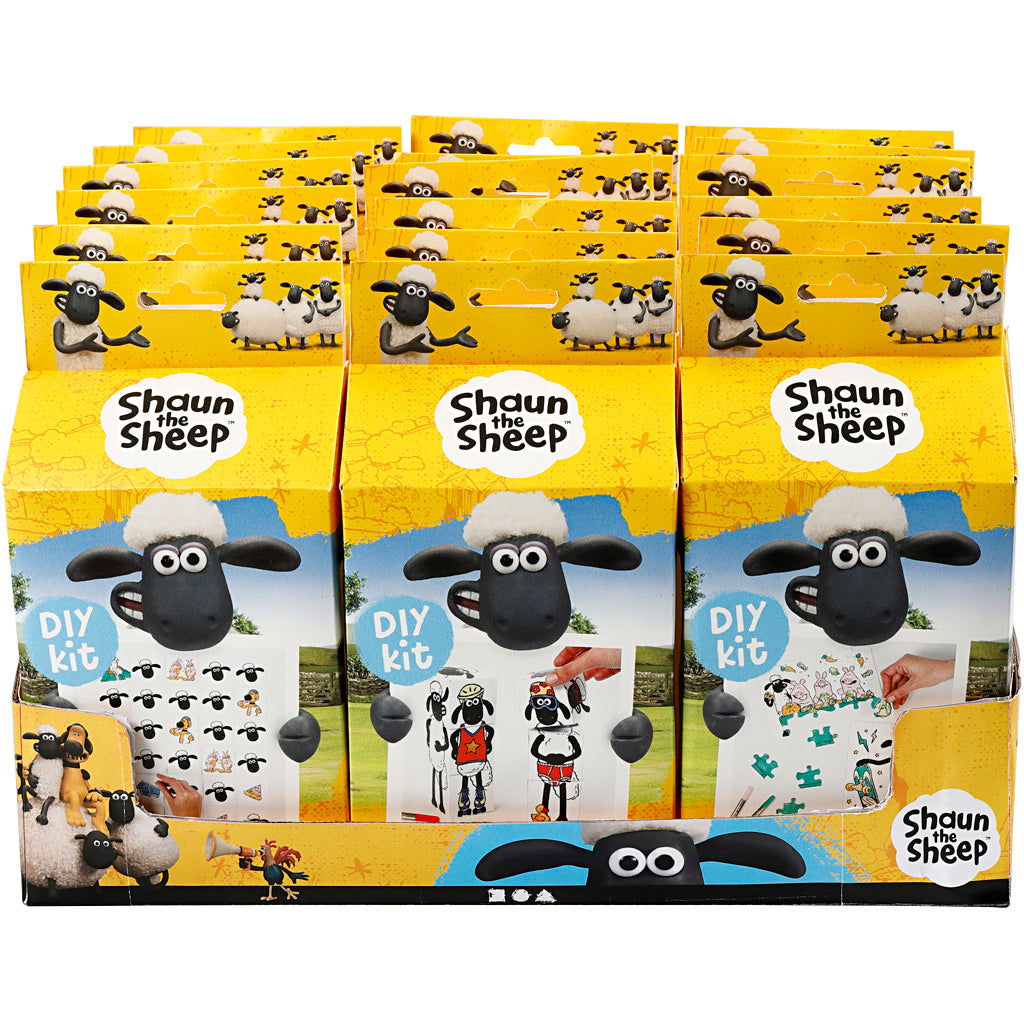 Material set with coloring of printed motifs on stack blocks, puzzles and memory game, all designs are motifs from 'Shaun the Sheep' Contents: 3 different designs of 6 pieces. Comes in practical table display (36.5x31x8 cm).